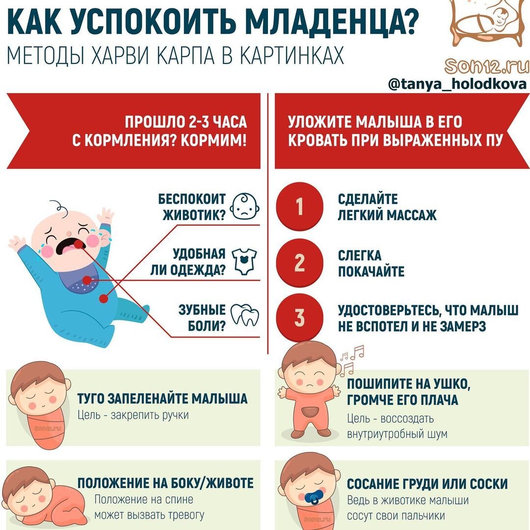Просили посты для малышей 0-3х месяцев? Ловите! Не забудьте поставить лайк, ведь мы очень старались и отрисовали Вам для наглядности инфографику. ⠀ Первые три месяца- не самые простые и понятные для родителей. ⠀ 🤱🏼Знакомство с малышом, его темпераментом, аппетитом. Налаживание лактации. ⠀ 🌙☀️До 3-4х месяцев биоритмы малыша еще не сформированы. Малыш легко и быстро устает. Пока сложно говорить о четком режиме дня. Пока это- ритм дня, с иногда вырисовывающейся последовательностью. Но очередной скачок развития ведет к пару недель хаоса. Затем снова сон малыша немного выравнивается. ⠀ А теперь обратимся к инфографике. Харви Карп, всемирно известный педиатр, популяризировал и разъяснил казалось бы понятные вещи. Но всё важное- в простоте и плане действий. ⠀ Дорогие будущие мамы и мамы младенцев, зрительно сохраните себе эту картинку перед глазами и не паникуйте, если малыш плачет. Добавьте пост в закладки. По порядку ищем и анализируем причину плача и ДЕЙСТВУЕМ! Никогд