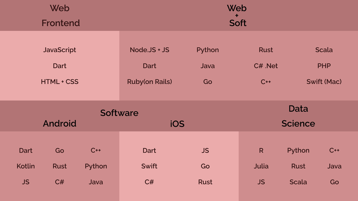Я изучал информацию об языках и надеялся, что так выберу на котором кодить. Полагался на мнение блогеров. Выбирал по количеству направлений, в которых могу его использовать. Но так и не нашел то, что искал. Что случилось? Для меня стало проблемой, что мне нравятся разные ЯП: Java привлекает мощью и количеством вакансий, Go своим сообществом и простотой, Rust необъяснимой магией и возможностями, Python проявляет себя во всех областях IT. Как тут выбрать? Метания продолжались весь 2020 и в начале 2021 я решил, что ситуацию пора исправить. Идея была проста: поставить языкам баллы и у кого больше — на том и кодить. В этом способе проявился нюанс, о котором я сам догадался не сразу. Обо всем по порядку. Разрабатываем схему. На листе бумаги или в удобном для вас редакторе напишите интересные направления. Я сделал так: одно направление — одна колонка. Теперь заполните эти направления любыми языками, которые нравятся. Главное, не бойтесь, что кто-то из ЯП попадет в колонку, где ему «не место».