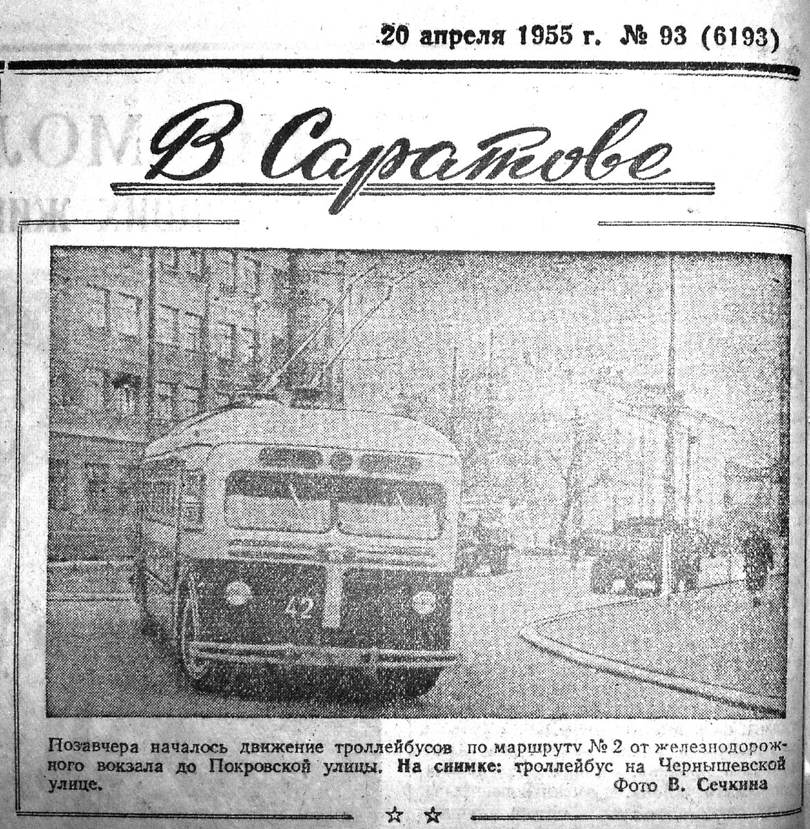18 апреля 1955 года – началось движение троллейбусов к Волге – через Октябрьскую до Покровской улицы (ныне – Лермонтова). Кольцо располагалось вокруг зданий, где сегодня расположены музей Федина и ресторан «Soho». Отсюда троллейбус снова поднимался по Октябрьской.