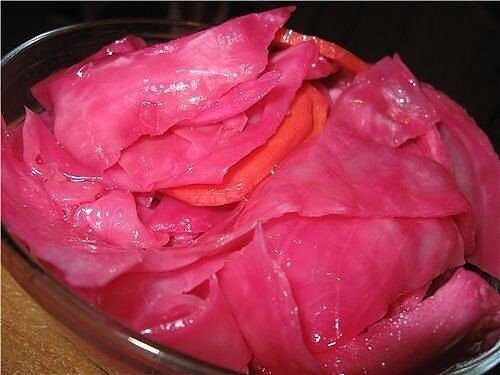 Ингредиенты: Капуста - 2 кг Морковь - 2 шт Свекла - 1 шт Для маринада: Вода - 1 л Сахар - 150 г Соль - 2.5 ст.л. Подсолнечное масло - 150 г Лавровый лист - 2 шт Душистый перец - 2 горошины Уксус (9%) - 150 г Чеснок - 1 головку 1. Капусту весом 2 кг нарезать на квадраты (где-то 3 х 3 см) или прямоугольники. 2. Нарезаем соломкой или на крупной тёрке 2 морковки, 1 большую свеклу. Все это перемешать, положить в кастрюлю. 3. Для маринада смешиваем воду, сахар, соль, масло, лавровый лист и перец. Все это кипятим, снимаем с огня и добавляем уксус и раздавленный чеснок. 4. Горячим маринадом заливаем капусту в кастрюле, сверху накрываем тарелочкой без груза (чуть придавить рукой сначала, чтобы немного маринада появилось визуально сверху, далее он сам подойдет под тарелку). 5. Оставляем на день при комнатной температуре. Через день можно употреблять. Любители острого могут добавить перчик и чили