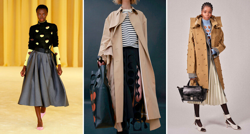 Как не жаль, но пора уже задуматься о том, что мы наденем, когда наступит осень, а с ней и прохлада. Август - самый подходящий месяц для планирования осеннего гардероба. Что будет в моде осенью 2021? На какие модные тренды обратить внимание? Сейчас стоит к походу в магазин подготовиться (там пока ещё нет новых коллекций): разобрать свой гардероб, понять, чего не хватает, составить список покупок, проанализировать тренды, выявить подходящие. «Дырки» В прошлом году были разрезы, сейчас они плавно перекочевали в дырки))) Задала такой тренд Миуча Прада в своей летней коллекции для Prada. Остальные модные дома дружно подхватили этот тренд и представили в осенней коллекции. Фото: vogue.ru Дырки могут быть где угодно: на юбке, свитере, сумке и даже обуви. Выбирайте дырки с ровным обработанным краем, чтобы они не выглядели неряшливо. Рванина на джинсах к дыркам не относится))) Водолазка в дырках - интересная вещь в гардеробе, которая задаст хулиганское настроение всему образу. Фото: vogue.ru