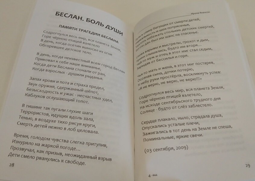 Началось всё лет 6 назад с того дня, когда моя московская подруга, учительница, спросила, нет ли у меня стихов о бесланской школе, захваченной в 2004 году террористами. Таких стихов у меня тогда не было. Привычная к подобным просьбам, я уселась за компьютер, для начала набрав в сетевом поиске «трагедия Беслана», чтобы найти хоть какую-то информацию по данному вопросу. Информации в интернете оказалось более, чем достаточно. Я старалась выбирать не официальные, тщательно профильтрованные фильмы, а любительские кадры, порой сделанные наспех, иногда некачественно, но содержащие в себе непосредственно живую энергетику событий… Так я просидела за компом свои первые три трудных «бесланских» вечера, просматривая видео, фото и читая форумы и интервью о случившейся трагедии, рыдая в голос от переполнявших душу горьких впечатлений. На четвёртый вечер появилось тематическое стихотворение «Памяти трагедии в Беслане». Это было в 2009 году, когда стихов на эту тему в сети выкладывалось ещё немного,