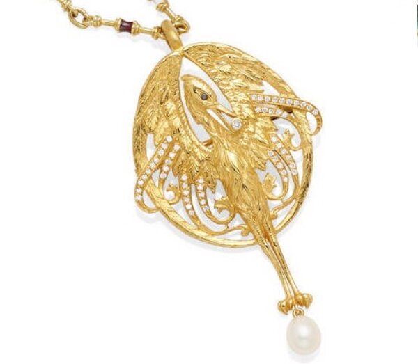 Кулон с изображением птицы и шелковой кистью, украшенный витражной эмалью plique-à-jour и бриллиантами, Masriera,1919-1925 гг.