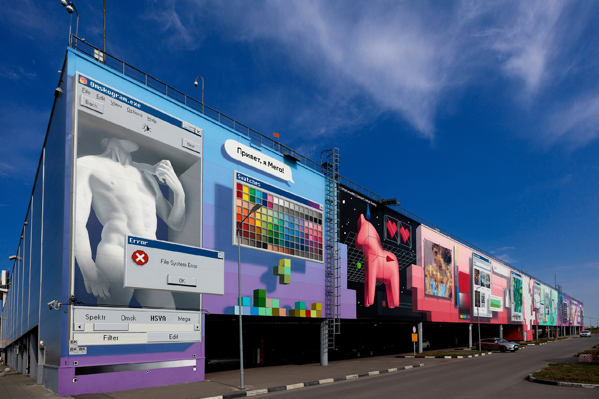 Это заглючивший Windows 95 года. 3D-элементы приобретают объем с разных ракурсов. Рисунок огромный — 2250 квадратных метров. Там есть не только торс Давида, но и омские пасхалки, о которых нам остается только догадываться.