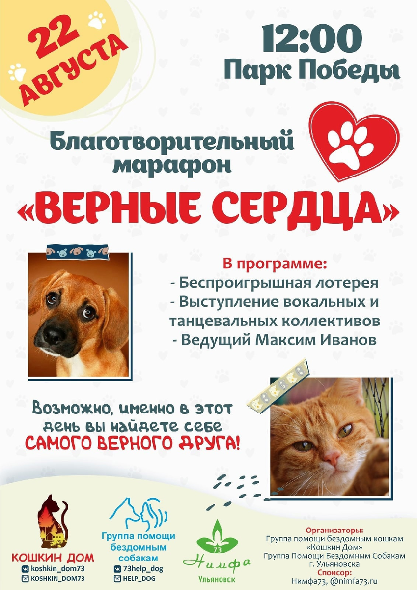 🎉🎉🎉ВСЕМ! ВСЕМ! ВСЕМ!🎉🎉🎉 22 августа в 12:00 в парке Победы г. Ульяновска стартует долгожданный марафон "Верные Сердца" 💗💗💗 Группа помощи бездомным собакам г.Ульяновска и КОШКИН ДОМ - помощь бездомным кошкам Ульяновска совместно с Волонтёрским движением "Вверх" проводят очередной Благотворительный марафон в поддержку бездомных животных нашего города. 🎁 🎧 Будет отличное мероприятие! Берите с собой позитивное настроение и вперёд - приходите к нам! Приходите с друзьями, семьями и непременно приводите маленьких деток. У нас всегда интересно! И у вас есть возможность "поймать двух зайцев сразу" - получить удовольствие и поддержать доброе дело! 🎁🎤 Быть может, именно 22 августа в парке Победы Вы встретите своего настоящего хвостатого друга и подарите ему ДОМ! 🐈🐕🏩 🎁🐾 Если вы хотите что-то передать нашим подопечным (корма, крупу, амуницию, средства обработки, лекарства, миски, игрушки), можете это сделать на нашем марафоне. Помните только о том, что скоропортящиеся продукты лучш