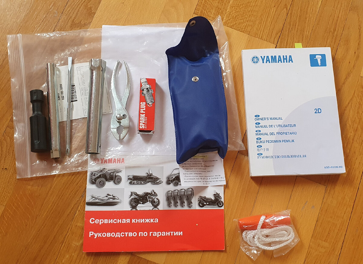 Доброго дня всем читателям. Не так давно я стал счастливым обладателем лодочного мотора Ямаха на 2 л/с. К своей лодке (Лоцман М260) я искал именно его. Казалось бы, а чего искать-то их полно в магазинах. Но отдавать 40К за моторчик который будет молотить по ильменям и прочему заросшему камышом и травой мелководью не очень хотелось. Но хотелось надежности и качества. В итоге за 3 месяца поисков был найден мотор в идеальном состоянии. Т.е. даже скажу так, по состоянию он был новый. Купил я его за 23 т.р. т.е. по цене аналогичного по мощности китайца. И так, что входит в комплект: Свечной ключ, торцевой ключ, отвертка, пассатижи, запасная свеча, дергалка, инструкция, сервисная книжка, чехол для инструмента. Так же в комплекте идут запасные шпонки и шплинты (2 комплекта). Они закреплены на румпеле. Вот в принципе и все что было в комплекте, ну и собственно говоря сам мотор. После покупки решил детально его еще раз осмотреть. Снял колпак, точнее разобрал. Он из двух половин, чтобы снять одн