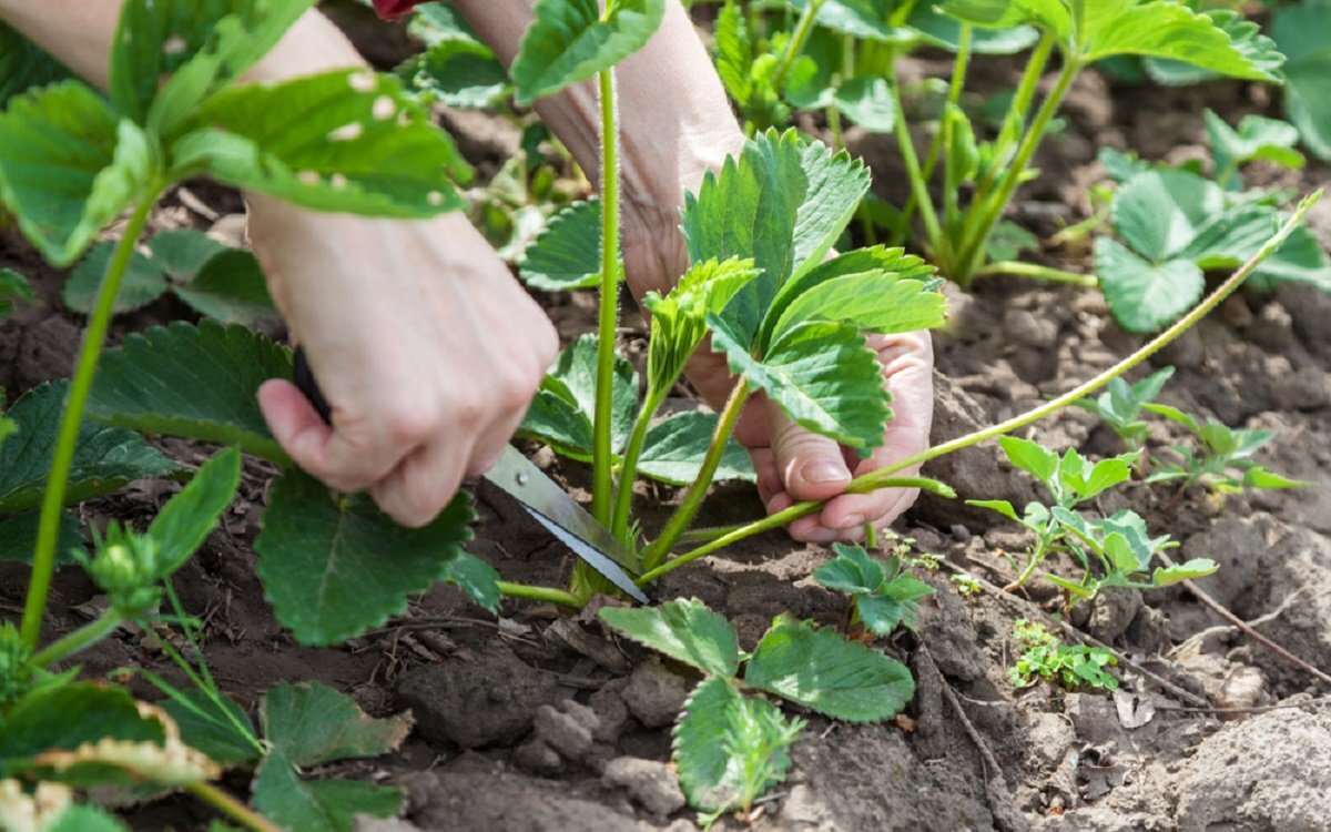 Клубника — вкусная и ароматная ягода. В ней содержится много полезных для организма витаминов, минералов, микроэлементов и антиоксидантов. Она сохраняет большую часть своих качеств не только в свежем виде, но и замороженной, в варенье или компоте. Чтобы она радовали урожаем каждый год необходим правильный уход, в частности регулярная обрезка. Для чего необходимо делать обрезку Среди огородников нет единого мнения стоит ли обрезать клубнику. Но все же многие считают что нужно это делать для подготовки к следующему плодоношению. И для этого есть объективные причины. Важно! Для того, чтобы вредители, упавшие во время обрезки, не перезимовали в земле и не появились на грядках весной, почву под клубникой нужно полить раствором марганца. Когда лучше обрезать клубнику Определенных сроков обрезки не существует, главное чтобы период плодоношения уже завершился. Чаще всего растения обрезают во второй половине июля или в первых числах августа. Лучше всего это делать рано утром или ближе к вечеру,