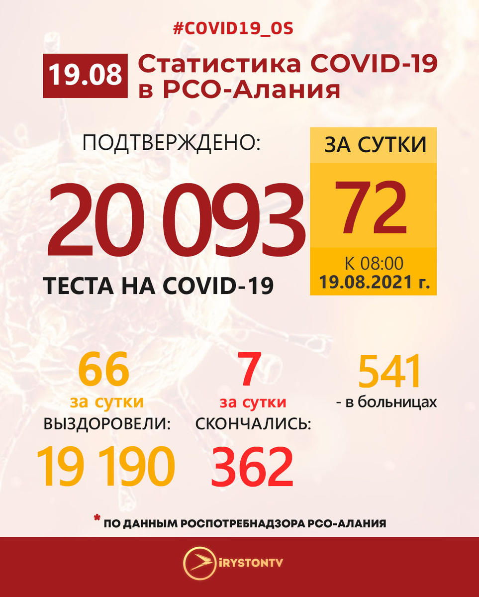 По данным Роспотребнадзора РСО-Алания на 08:00 19 августа 2021 года в Республике Северная Осетия-Алания зарегистрировано 20 093 (+72 за сутки) случая заражения новой коронавирусной инфекцией.