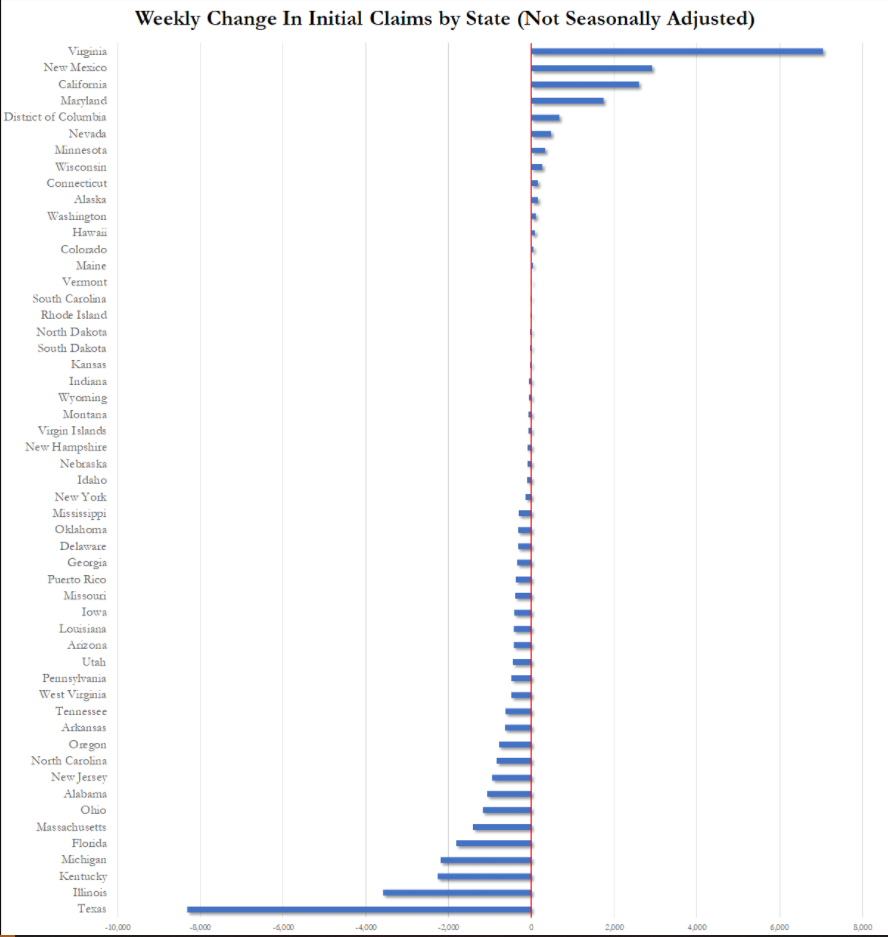 Количество заявок на пособие по безработице в США упало до минимального уровня с самого начала пандемии 348 тысяч, при прогнозе в 363 тысячи. Как получились такие хорошие цифры и что за этим последует? Давайте разбираться. 👉🏻 На картинке к посту вы видите, что сильнее всего количество заявок снизилось в Техасе, которое составила львиную долю в сегодняшнем снижении. Основная причина такого большого падения, скорее всего, в Техасе из-за открытия школ с 16 августа плюс жёсткая политика губернатора в виде того, что всем пора перестать замечать COVID. Кроме того, в Техасе отменили пандемические пособия по безработице в конце июня. Но нужно понимать, что уже следующие данные по пособиям будут чуть хуже сегодняшних.