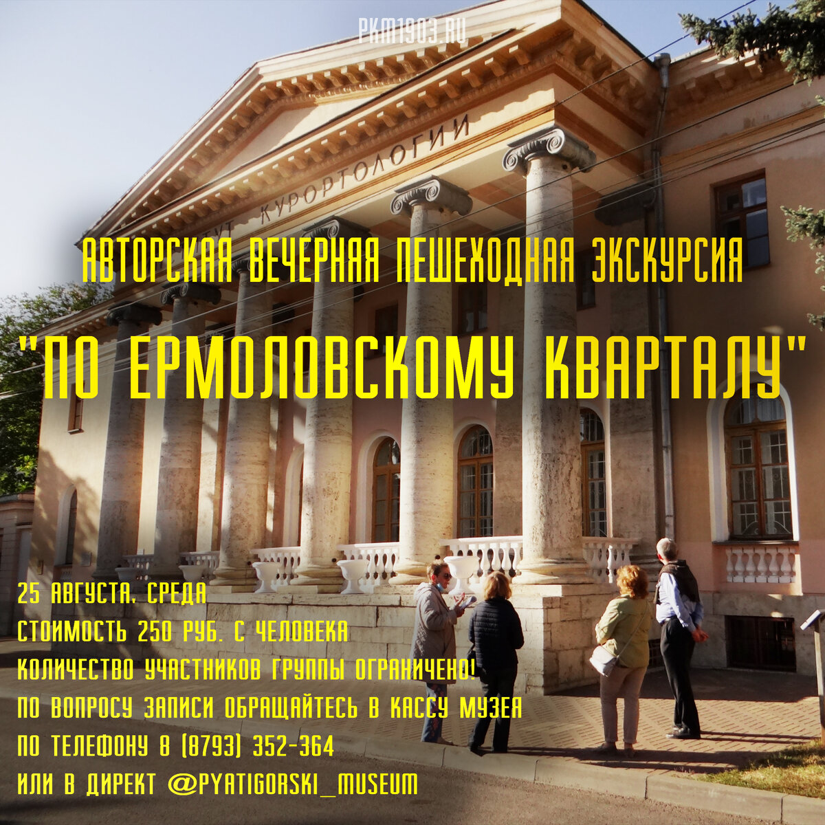 25 августа в 19-00 состоится авторская вечерняя пешеходная экскурсия по старой части города Пятигорска "По Ермоловскому кварталу". Каждый уголок старого Пятигорска по-своему неповторим, имеет свое лицо, свою уникальную историю, свою тайну. Один из них, прилепившийся к склону горы Машук, носит неофициальное название "Ермоловский квартал". Наряду с верхней частью улицы Кирова это участок самой ранней в городе жилой застройки. Он возник ещё в то время, когда главнокомандующим на Кавказе был генерал А.П. Ермолов. Одна из первых построек здесь - усадьба А.Ф. Реброва возникла ещё в 1818 г. Полностью квартал был застроен к концу 20-х гг. XIX века. Несмотря на то, что в последующие десятилетия дома перестраивались и реконструировались, обзаводились пристройками и дополнительными этажами, улицы и дворы Ермоловского квартала больше, чем где-либо в городе сохранили исторический облик, неповторимые черты и сам дух старого Пятигорска, запечатлено в литературных произведениях и исторических фильмах.