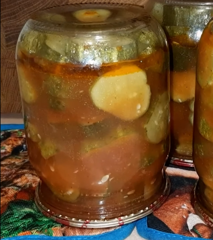 Всем привет! Мы любим все засаливать для зимы наши помидорки в нашем собственном соку, ну, конечно, огурцы! В абсолютно разнообразных вариациях. Зимою всё это очень неплохо уходит. Обожают как взрослые, этак и дети. Ингредиенты можно посмотреть в конце статьи. Приятного просмотра! Приготовление: 1. Нарезаем огурцы диаметром 2см. 2. Кладём в огурцы в кастрюль, и солим, и добавляем сахар столовой ложкой. 3. Наливаем в кастрюль стопочку воды. 4. 5 столовых ложек кетчупа чили. 5. Один лавровый лист в кастрюлю, и перец горошек. Заливаем это всё 500мл воды. 6. Одну головку чеснока пропускаем через пресс. 7. Перемешиваем всю нашу консистенцию, и ставим на огонь. Когда начнёт закипать - ставьте таймер 5 минут. 8. Распределяем наш рецепт по банкам, закрываем, и оставляем их на холодные временна. Ингредиенты: Соль 1столовая ложка Сахар 1столовая ложка Уксус 9% 50мл Растительное масло 50мл Кетчуп чили Лавровый лист Перец горошек Вода 500мл Чеснок ---------------------------