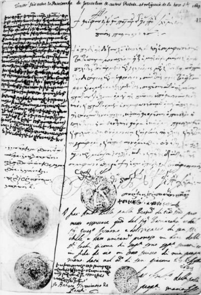 Если вы откроете любой интернет-ресурс, вы увидите список армянских патриархов Иерусалима, начиная с VII века. Но на самом деле армянские священники, имевшие в Иерусалиме резиденцию, не были и не назывались патриархами иерусалимскими. Как минимум до XVII века включительно, согласно богатейшим собраниям договоров между церквами, они были просто епископами. В какой-то момент (я пока не могу точно указать дату) армянских епископов стали называть патриархами. Но это - не более, чем самодеятельность армянского духовенства, как и в том случае, когда армянская церковь вдруг стала называться "апостольской". Фотокопия оригинала договора 1624 года между Патриархом Иерусалима Феофаном III, представителями латинской церкви и армянским епископом Григорием, которого сегодня почему-то величают "Армянским Патриархом Иерусалимским" Крикором Канцагеци (1613-1645). Об этом пишет Филипп Экозянц на своей странице в Фейсбуке.