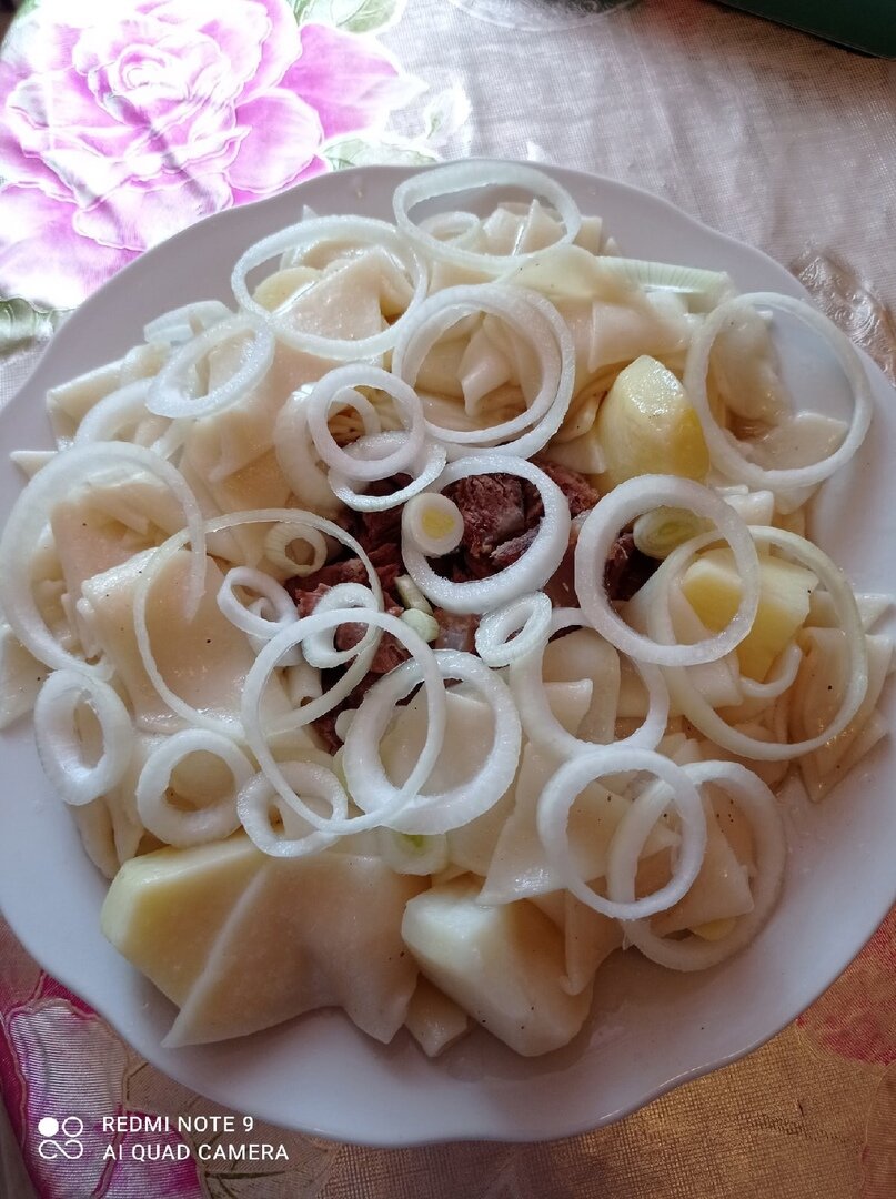 Сегодня я хочу поделиться с вами рецептом, как приготовить бешбармак классический. Блюдо получается невероятно сытным, я бы даже сказала, что слишком сытным. Ингредиенты: Говядина — 600 г Лавровый лист — 1 шт Перец горошком — 2 шт Яйца — 2 шт Вода — 200 мл Мука — 600 г Лук — 2 шт Соль, перец — По вкусу Можно еще добавить картошку по желанию. Приготовление: 1. Муку смешайте с солью, разбейте 2 яйца. 2. Влейте воду и замесите крутое тесто. 3. При необходимости подсыпайте еще муки, чтобы тесто не липло к рукам и рабочей поверхности и получилось тугим. 4. Тесто порежьте на ромбы. Для этого раскатайте его как можно тоньше, порежьте сначала на полоски, а затем каждую полоску порежьте на небольшие ромбики. 5. Отварите говядину до готовности в подсоленной воде примерно в течении часа. За 30 минут до готовности отправьте в кастрюлю перец горошком и лавровый лист. 6. Готовое мясо выньте из бульона (бульон не выливайте!), охладите и разделите на волокна. 7. Несколько луковиц