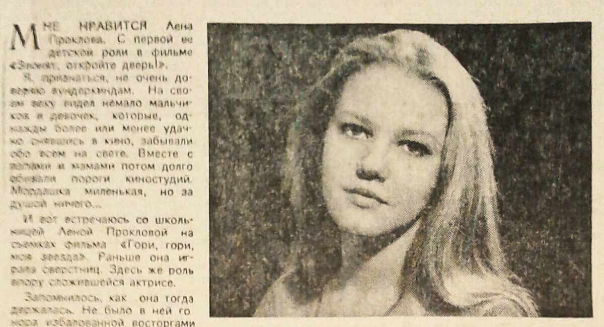 Елена Проклова сейчас является популярной персоной во всевозможных средствах массовой информации и социальных медиа. Эта популярность связана с ее многочисленными громкими заявлениями о своем прошлом и прошлом многих знаменитых людей. Ее откровения, в свою очередь, вызвали волну обсуждений и разнообразных комментариев. Многие медийные личности высказались о Прокловой. А вот что говорил о ней Евгений Леонов, народный артист СССР. Его суждения были опубликованы в номере «Литературной газеты» от 19 апреля 1978 г. В свете сегодняшних событий было интересно прочитать. «Очень общественный человек...» Ниже приводится полный текст статьи великого актера Евгения Леонова. Каждый может составить свое мнение о Е. Прокловой, Е. Леонове и о той далекой, растаявшей во времени, эпохе. Мне нравится Лена Проклова. С первой ее детской роли в фильме «Звонят, откройте дверь!». Я, признаться, не очень доверяю вундеркиндам. На своем веку видел немало мальчиков и девочек, которые, однажды более или менее удач