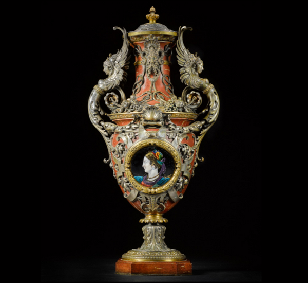 Ваза с крышкой из красного мрамора в оправе из позолоченной и посеребренной бронзы в стиле Ренессанса, дизайн Луи Констана Севена (1821-1888), эмаль Клавдия Поплена (1825–1892), литейщик Дезире Аттарж (1820–1878), высота 93 см, F. BARBEDIENNE, Париж, около 1880 г.
