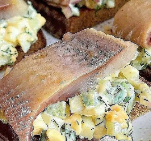 Горчица - 1/3 ч. Приготовление: Яйца,огурец,зеленый лук мелко порезать и заправить майонезом с горчицей. Затем нарезаем хлеб небольшими кусочками примерно 6 на 4 см. и можно немного подсушить на сухой сковороде. Смесь из яйца и огурца ложим на ломмтик хлеба так чтобы не разваливалось и сверху кусочек сельди очищенной от костей чуть меньше по размеру чем хлеб.Сверху украшаем веточкой укропа и можно подавать. Приятного аппетита.