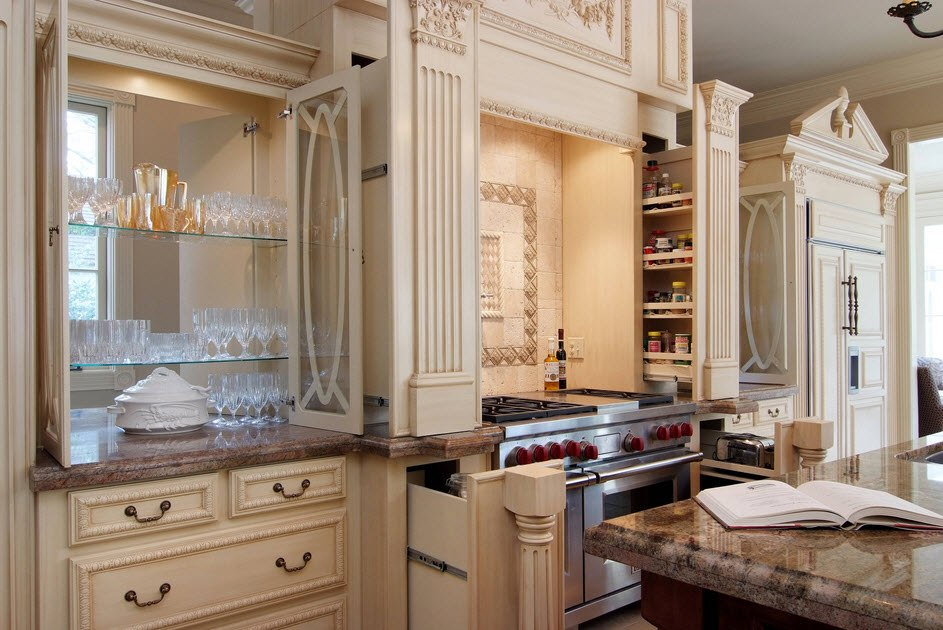 Но что делать, когда эти пилястры занимают то самое, необходимое место? Просто спрячьте в них полки. Такое решение станет не только красивым украшением вашей кухни, но и даст вам возможность хранить там приправы, масла или бутылки с вином. 2) Шкаф для тарелок Большие праздничные тарелки, на которых торжественно выносятся особенные блюда, есть в каждом доме. Но не все хозяева смогли найти им место на кухне. Вот хорошая идея как можно удобно и деликатно хранить хрупкий фарфор. И низко кланяться ему каждый раз не придется! 3) Хлебница под рукой Проблемой многих становится хле