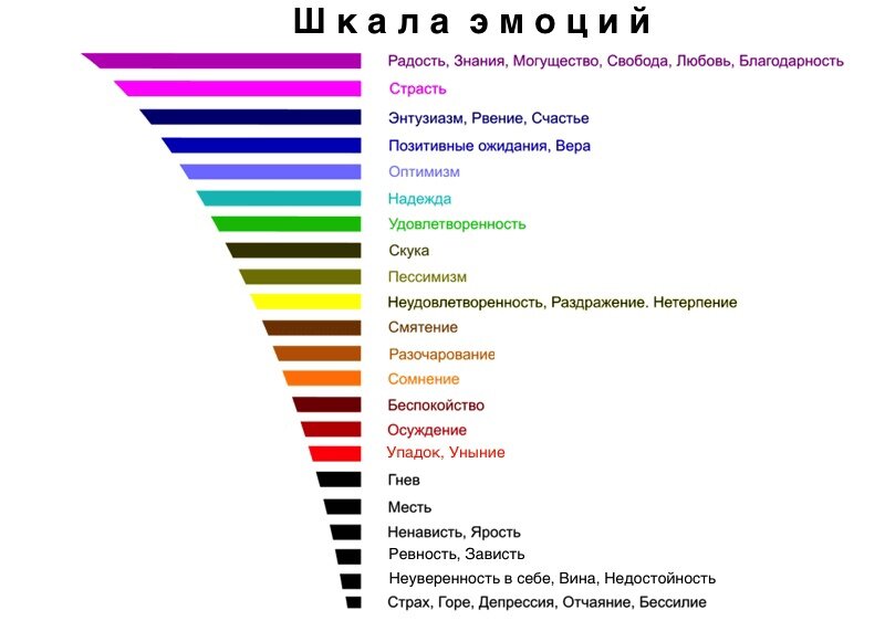 Мы все прекрасно знаем, что есть позитивные эмоции и негативные. На картинке хорошо видно разделение по зелёненькой полосочке Удовлетворённости. У любого человека есть базовое эмоциональное состояние. От одного известного психолога я слышала, что у россиян базовая эмоция — это грусть. Можно согласиться или нет, но он не особо промахнулся, на мой взгляд.
