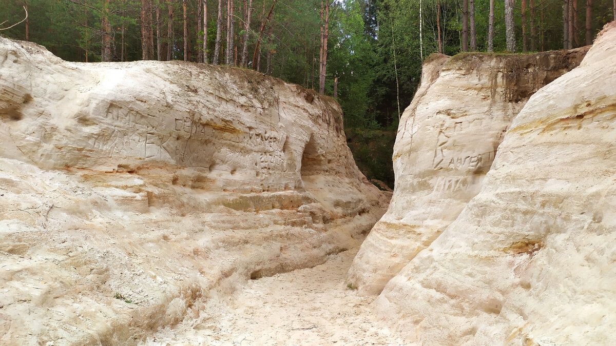 Это место называется "Малый Лужский каньон". И таки да, это действительно каньон! Он небольшой, не длинней 50 метров. Начинается с маленького водопадика, в который превращается лесной ручей. Сейчас, несмотря на прошедшие дожди, он почти совсем пересох: Но иногда, похоже, бывает и полноводным. Даже собственные сталагмиты вырастил! Песок очень нежный и светлый. Стенки красивые - если бы еще не не граффити... Речка, которая периодически в этом каньоне течет, впадает в небольшое торфяное озеро: Пляж приятный, вода чистая, можно искупаться: Дорога от шоссе грунтовая, с лужами и колдобинами, но в принципе, подобраться к озеру можно и на обычном седане, внедорожник не обязателен: Вот это место на карте: В Яндекс-навигаторе так и называется: Малый Лужский каньон. Рядом с этим каньоном раньше было еще небольшое прозрачное озеро внутри карьера с белым песком. Но к сожалению, вот такого больше нет: Сейчас озеро перекопали, потому что карьер активно работает для расположенного поблизости стекол