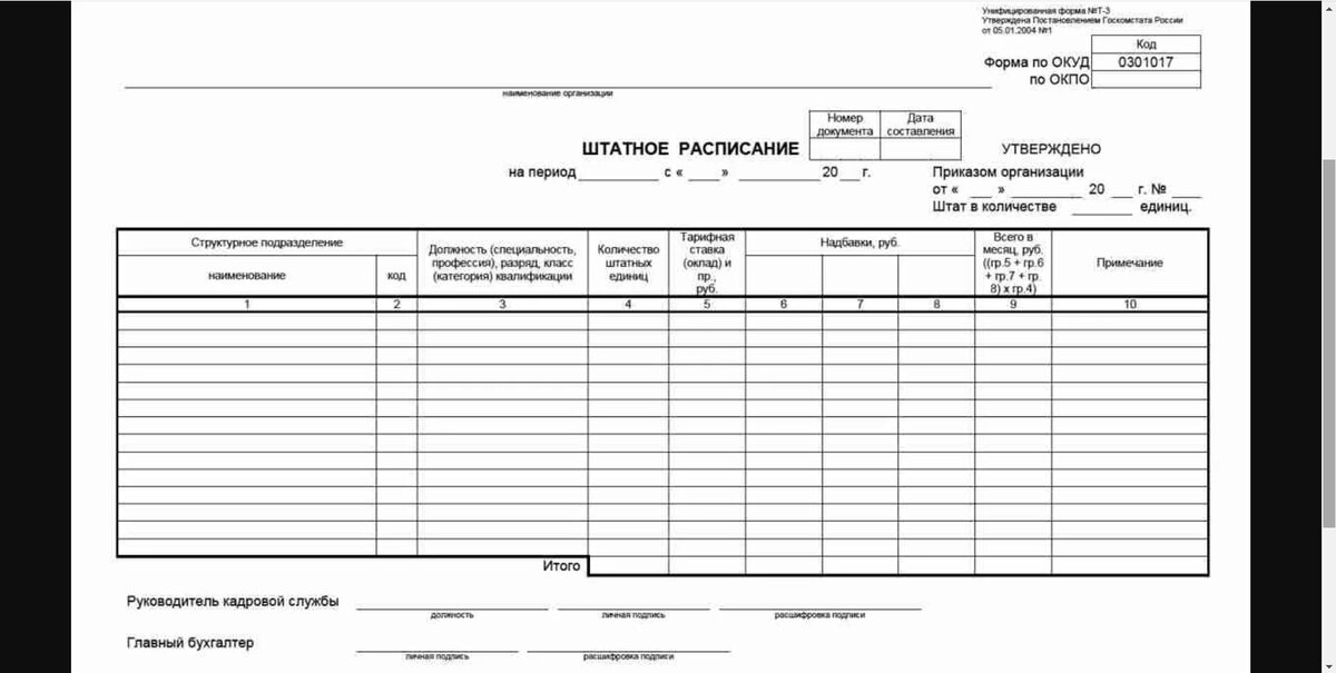 Либо можно разработать свою форму документа, утвердить приказом, и тогда будет применяться именно она. В статье мы будем говорить именно об унифицированной форме штатного расписания Т-3, которая была утверждена постановлением Госкомстата №1 от 5 января 2004 года. Эту форму можно дополнить, добавить в неё поля, например, дополнительные подписи других сотрудников, но сокращать и убирать поля, строки, значения из этой формы нельзя.