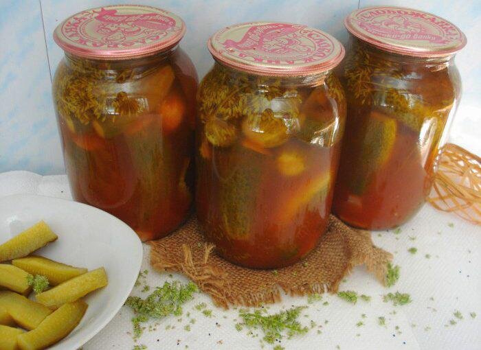 1. Огурцы с томатной пастой и корицей Ингредиенты: Пошаговый рецепт приготовления огурцов с томатной пастой и корицей 1. Огурцы хорошо промываем и замачиваем в холодной воде на 3 часа 2. Нарезаем полукольцами лук, а чеснок измельчаем 3. Зелень нарезаем крупно и выкладываем её часть на дно стерилизованной банки. Сверху закладываем огурцы, добавляем душистый и черный перец, а также лук с чесноком. В конце кладем оставшуюся зелень 4. Заливаем банку с огурцами кипятком, накрываем крышкой и оставляем на 7-10 минут 5. Сливаем жидкость из банок, снова доводим её до кипения и заново заливаем огурцы. Накрываем крышкой. Так же оставляем на 7-10 минут 6. Снова сливаем жидкость с огурцов в кастрюлю, кладем туда сахар, соль, корицу, лавровый лист и томатную пасту. 7. Доводим маринад до кипения и заливаем им огурцы. Накрываем крышкой и ставим в кастрюлю с водой для стерилизации. 8. Стерилизуем банки при умеренном кипении примерно 20 минут, а после закатываем. 2.Аджика из помидоров Ингредиенты: Как