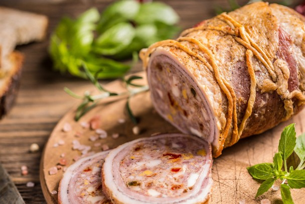 Галантин — холодное блюдо из постного мяса птицы, дичи, свинины, телятины и кролика, покрытое желе. Кроме кусочков мяса в галантин добавляют фарш, смешанный с яйцами, пряностями и другими ингредиентами. Происхождение слова доподлинно неизвестно. Согласно одной версии, оно связано с искаженным словом «желатин». И, действительно, насыщенный бульон, окружающий мясо или птицу, содержит желатин и застывает благодаря нему. Другие источники связывают «галантин» с курицей – с испанского, итальянского и прованского языков слово «gallina» переводится как «курица». В средневековой Франции галантин готовили следующим образом: птицу, дичь, свинину, телятину и мясо кролика отваривали в одной посуде, затем отделяли мясо от костей и делали фарш. В него добавляли сырое яйцо и специи, разводили бульоном до консистенции густой сметаны и выставляли на холод. Иногда блюдо даже ставили под пресс. Во времена увлечения русской аристократией всем французским, включая не только моду, культуру и язык, но и изыс
