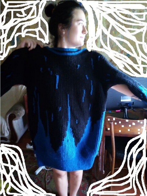 Внучка попросила связать ей джемпер с рисунком по ее эскизу (она увлеклась моделированием на графическом планшете). По проекту должен получиться удлиненный оверсайз со спущенными плечами, свободными рукавами. Джемпер готов и я делюсь ходом работы. Вот эскиз, который дала мне внучка: Мы решили взять его за основу, меняя цвета, «как фишка ляжет». В интернет-магазине подобрали синюю пряжу, черная такая уже была в запасах. Для начала набрала 17 петель, чтобы связать образец и просчитать нужное их количество. При вязании спицами № 2,5 у меня получилось, что на 10 см резинки 1х1 (со съемными петлями в лицевом ряду) приходится 24 петли. Основная вязка – «крупный рис». 10 см полотна содержит 17 п. Нужно учитывать, что это только ориентировочные данные. В процессе работы плотность может немного отличаться. Необходимое количество рядов в образце не высчитываю – ориентируюсь на параметры основных полотен. Это будут прямоугольники шириной 46 см и высотой 68 см. Естественно, вверху обозначится горл