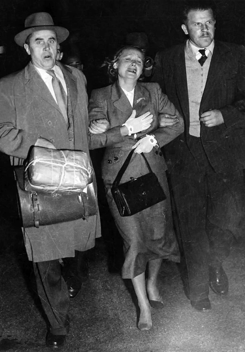 В одной из предыдущих статей я писала как в 50-е годы супругов из США наказать за шпионаж в пользу СССР. В этой публикации я снова расскажу про шпионские страсти, но на этот раз речь пойдет про советских граждан. Перед вами довольно интересный снимок, сделанный в 54-ом году в аэропорту Сиднея (Австралия). Два крепких суровых мужчины куда-то ведут под руки рыдающую женщину. Хрупкая дама одета очень элегантно. На одной ноге у нее отсутствует туфелька, скорее всего она потеряла ее при сопротивлении. Судя по лицам мужчин, журналисты их застали в расплох. Они явно не ожидали фотографа, а вот женщина появлению свидетелей вероятно была очень рада и скорее всего просила о помощи. Фамилии мужчин - Карпинский и Жарков. Имя женщины - Евдокия Петрова. Вместе с мужем Владимиром она работала в советском посольстве в Австралии. Евдокия трудилась шифровальщицей, а ее супруг работал в должности третьего секретаря. В действительности оба супруга были офицерами КГБ и шпионили в пользу СССР. Владимир Пе