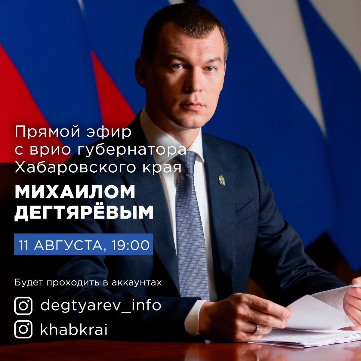 В среду, 11 августа, врио губернатора Хабаровского края Михаил Дегтярёв лично ответит на ваши вопросы в прямом эфире в Instagram @khabkrai и @degtyarev_info. Оставляйте свои вопросы в комментариях. Ставьте уведомления, чтобы не пропустить начало трансляции. Начало в 19:00! #михаилдегтярев #вриогубернатора