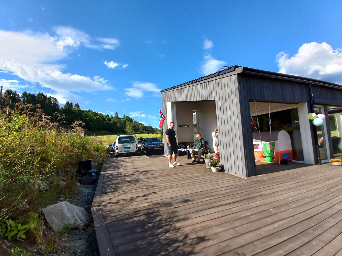 Внучке мужа Ариэлле исполняется 7 лет. В Норвегии дети учатся с 6 лет. Ариэлла перешла во второй класс. Машины гостей. На улице жарко. Поэтому праздник решили проводить на террасе и кухне. Благо большие размеры кухни позволяют спокойно там разместиться не одному десятку человек. Зять мужа Александр на правах хозяина праздника готовит бургеры и сосиски на гриле. Газон заднего двора участка почти готов. Установлены также бассейн и батут для детворы. Угощение - по принципу "шведского стола". Хотя это название норвежцев удивляет. Они называют это "буфет". Бургеры гриль, салаты и нарезки из овощей. Дети очень заинтересовались построенным для них кукольным домиком. Именинница - Ариэлла. Были приглашены члены семьи и близкие друзья. 15 человек. Подобная встреча - хорошая возможность поговорить, обменяться новостями и обсудить семейные дела. При этом на столах присутствовали исключительно безалкогольные напитки. Пепси и различные фруктовые газировки. Для желающих - кофе. Чай никто не пи