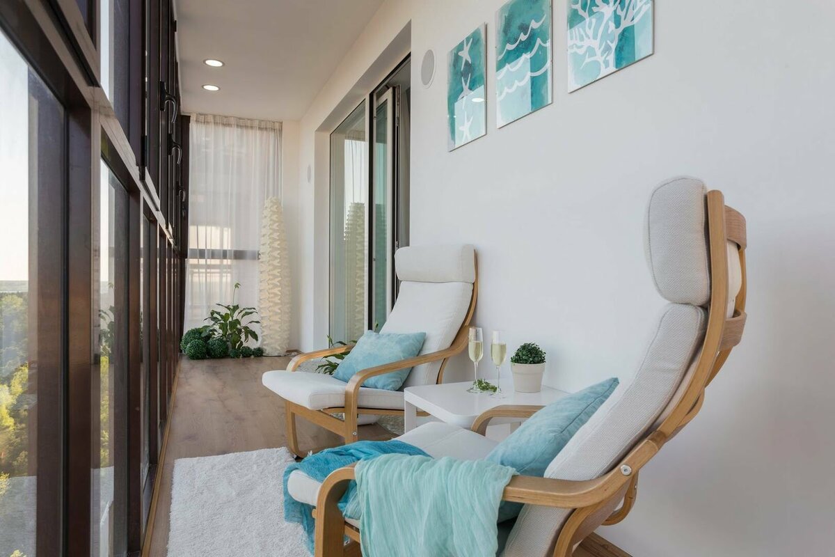Балкон может стать полноценной частью жилой площади, его можно использовать как кабинет, сад, мастерскую, место для любимого хобби или лаунж-зону. Показываем, как дизайнеры обустраивают эти дополнительные квадратные метры в своих проектах. Студия «Мечты сбываются», проект квартиры в стиле экоминимализм с видом на город В минималистичном интерьере для современной женщины дизайнер Евгения Ивлиева сосредоточилась на экологичности и природных материалах, а также на сохранении пространства максимально свободным и воздушным. В итоге в квартире организовали раздельные спальню, кухню и гостиную, а утеплённый балкон стал местом для отдыха и чтения. Подвесное кресло-гамак, декоративные подушки и цветы не загромождают помещение, и оно обильно наполняется естественным светом. Римские шторы на окнах помогают скрывать свет и солнечные лучи, когда нужен отдых. Проект квартиры в стиле минимализм с элементами экостиля В проекте Елены Маркиной квартира была с планировкой от застройщика. На площади 45 м2