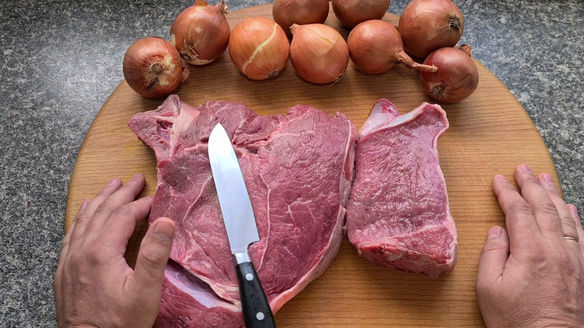 Привет Друзья! Делюсь своим любимым рецептом блюда из говядины. В нем сочетаются и простота приготовления и дальнейшая практичность уже готового блюда. Особенно его оценят те, кто много и до поздна работает. На подготовку уйдет не более 30 минут в выходной день. И затем всю неделю достаточно будет лишь менять гарниры. Говядину мою, срезаю ненужные пленки и нарезаю на куски нужного размера. Следом мелко рублю лук. Его нужно нарубить мелко, насколько это вообще возможно. Ну или измельчить в блендере. Как всегда список всего необходимого оставлю в конце статьи. Перекладываю мясо в сухой казан или кастрюлю, если вы будете готовить на домашней кухне. Распределяю лук, чтоб он полностью накрывал мясо и вливаю по стенке казана немного воды. Чтоб на первых минутах мясо не пригорело. Сверху на лук укладываю сливочное масло. Вот собственно и все! Правда ведь ничего сложного? Ставлю казан на печь и накрываю крышкой. Убавляю интенсивность горения на самый минимум и буду томить говядину примерно