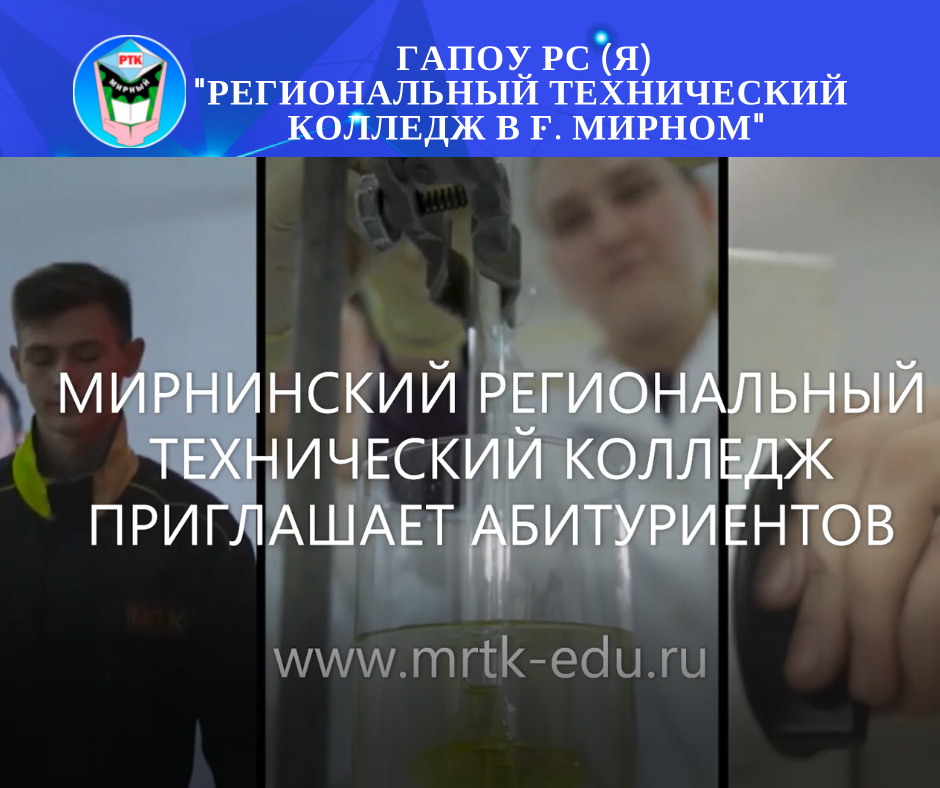 Уважаемые абитуриенты! УСПЕЙТЕ ПОДАТЬ ЗАЯВЛЕНИЕ В Мирнинский региональный технический колледж! 15 августа 2021 года завершается прием документов от абитуриентов, поступающих на очную форму обучения в ГАПОУ РС (Я) «Региональный технический колледж в г. Мирном» и филиалы «Удачнинский», «Айхальский», «Светлинский филиал энергетики, нефти и газа». В дальнейшем, прием документов и поступление будет осуществляться при наличии свободных мест. Приемная комиссия ГАПОУ РС (Я) "МРТК". https://mrtk-edu.ru/news/uvazhaemyie-abiturientyi-uspejte-podat-zayavlenie-/#megamenu Ссылки по теме: