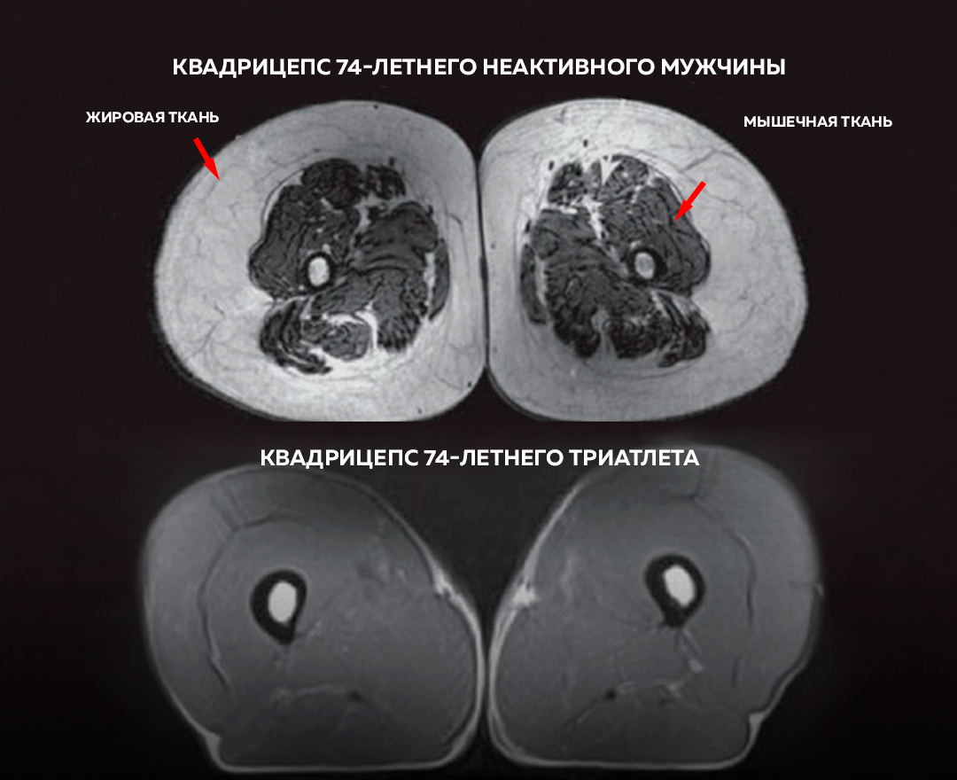 Нижний снимок — “срез бедра” 74-летнего триатлета. Как видите сами, на жировую прослойку приходится некий минимум, а весь объем бедра занят здоровой мышечной тканью. Ни единого признака атрофии.