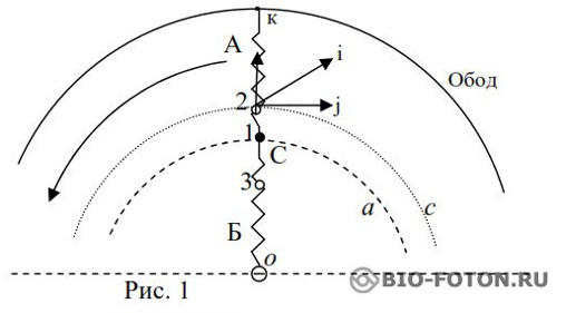 Закрутим колесо с некоторой скоростью. Когда скорость установится, тело выйдет из точки 1 и остановится, например, в точке 2 и будет двигаться по траектории с. Если оборвать связь тела с пружиной Б, то опыт покажет, что тело будет двигаться по вектору 2i. При увеличении скорости вращения напряжение в пружине А будет становиться все меньше и меньше. Составляющая скорости тела от напряжения пружины А (направление 2к) будет становиться все меньше и вектор 2i будет все больше прижиматься к вектору 2j. И когда напряжение в пружине А станет равным нулю, данные векторы будут совпадать.