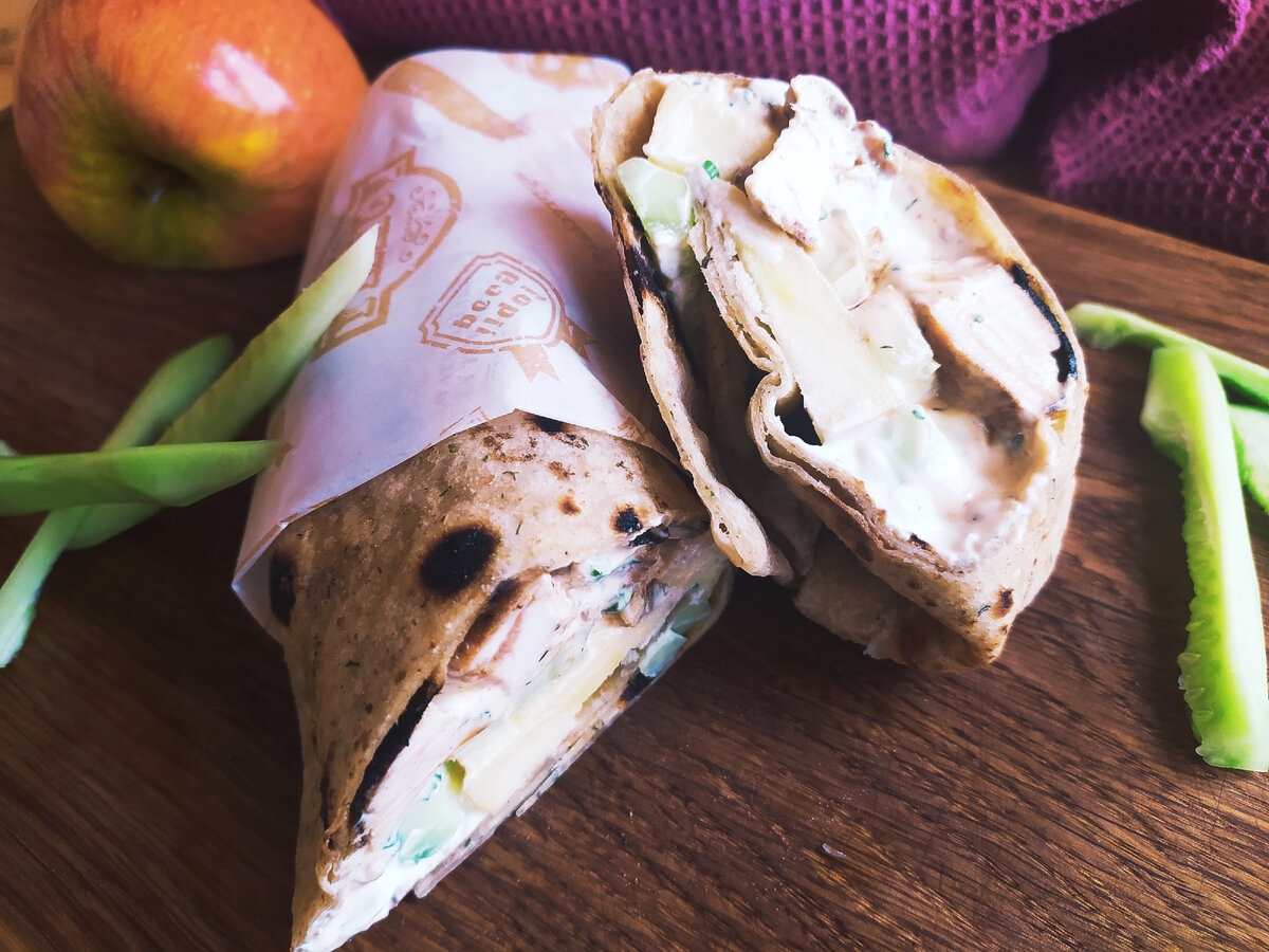 Куриное филе, свежие огурцы, сладкие яблоки и сливочный соус "ранч", завернутые в пшенично-цельнозерновые лепешки с зеленью. 3 пшеничные тортильи (здесь) (заменить 5 ст.л. (из 450 гр.) на цельнозерновую муку и добавить 2 ст.л. сушенной зелени)