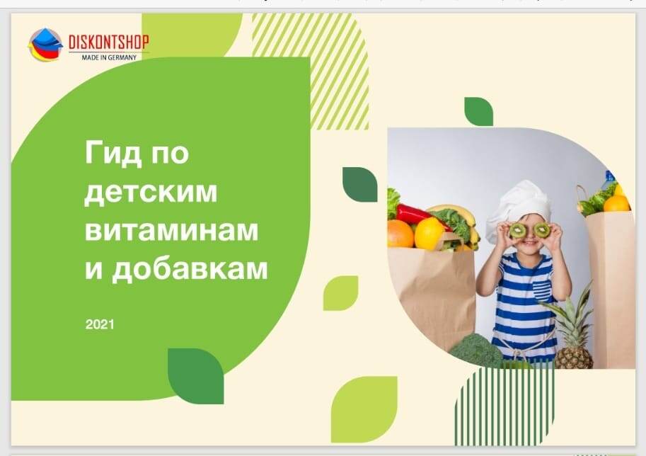 Уважаемые покупатели! Недавно мы задались вопросом: а существует ли какой-либо гид/справочник по детским витаминам из Германии? Допустим, вашему ребёнку 4 года, и нужно быстро найти подходящие витамины или пробиотики. Понадобится изучить множество инструкций, составов, прочитать особенности применения — на это уйдёт много времени. Насчитывается несколько сотен всевозможных пищевых добавок, но как в них разобраться? Мы провели немало часов в поисках гидов по БАДам из Германии и не нашли ни одного. И тогда мы задумались: а что если сделать небольшую книгу-классификатор, и в ней будет вся необходимая информация? Конечно! В течение 3-х месяцев мы систематизировали детские витамины, дорабатывали описания, уточняли составы, досконально переводили полные описания, и сделали вот этот 97-ми страничный гид: Ссылка на скачивание: https://diskontshop.eu/wa-data/public/site/pdf/gid.pdf Гид — это ваш помощник и проводник в огромном ассортименте немецких витаминов для детей. Его задача — помочь вам б