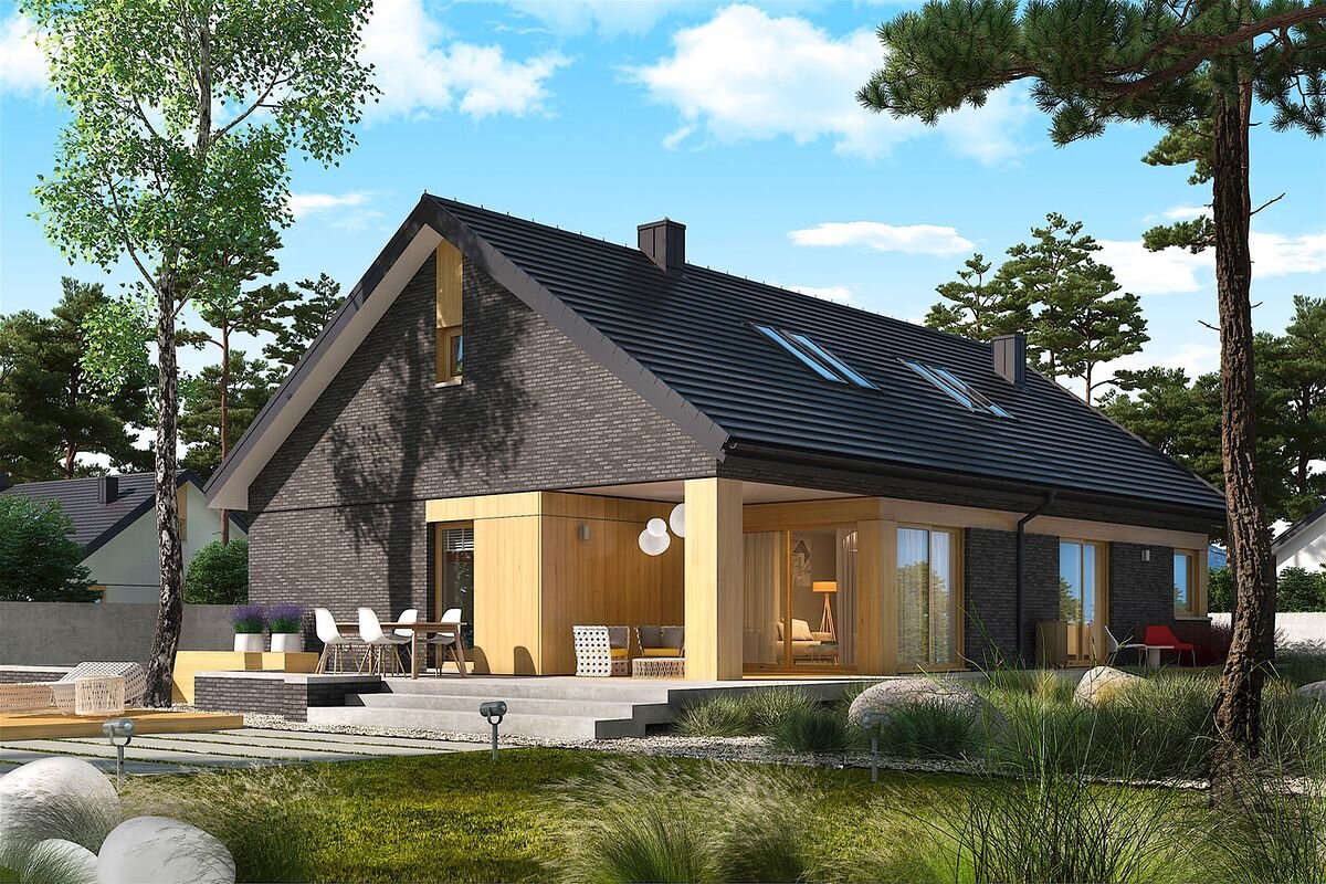 Вашему вниманию представляю проект дома 128.69 м2 + гараж 38.63 м2 + антресольный этаж 14.08 м2. Проект выполнен в современном стиле. Архитектурная композиция построена на игре цветовой гаммы. Брутальный графитовый неожиданно гармонично сочетается с цветом светлого дерева и придаёт облику дома респектабельный вид. Пластика фасадов достигается окнами разных размеров и формы в т ч панорамных. Веранда вырезана из общего объёма дома и находится под общей двускатной кровлей. Гараж гармонично интегрирован в общую композицию, благодаря его расположению и плоской кровле, под которой расположено крыльцо. Проект исполнен так, чтобы безболезненно можно отказаться от постройки гаража, ничего не меняя в остальной части композиции и плана. Большие панорамные двери в зоне террасы визуально стирают грань между окружающей природой и гостиной и конечно обеспечивают массой дневного света помещение. Планировка дома включает в себя три зоны разного назначения. Зона обитания перв