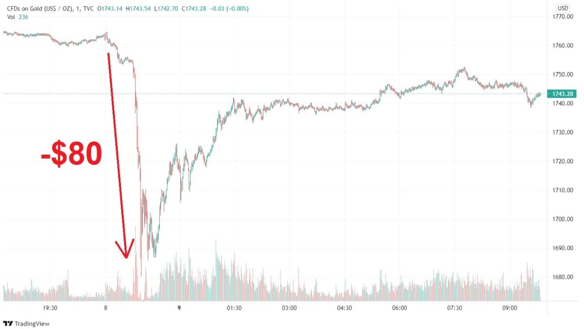 Новая неделя началась с внезапного обвала цен на золото и серебро. Утром на азиатских торгах, когда ликвидность находилось на низком уровне, цена золота в момент упала с $1760 сразу к $1680 или 4.5%. Это минимум с апреля. Сейчас цены восстановились примерно до -1% от закрытия торгов прошлой недели. Основным триггером для обвала стала статистика по рынку труда, вышедшая в пятницу (писали об этом здесь). Отчёт получился значительно сильнее ожиданий. Уровень безработицы понизился с 5.9% в июне до 5.4% в июле, а число занятых в несельскохозяйственном секторе увеличилось на 943 тысяч. Причём тут хороший отчёт по рынку труда? Как обычно все сводится к ожиданиям роста процентной ставки. Дело в том, что рынок труда - одна из главных метрик ФРС. Хорошие данные сильно увеличивают вероятность анонса ужесточения монетарной политики на традиционном августовском симпозиуме в Джексон-Хоуле. В свою очередь повышение процентных ставок плохо влияет на золото в долгосрочной перспективе. При росте ставок