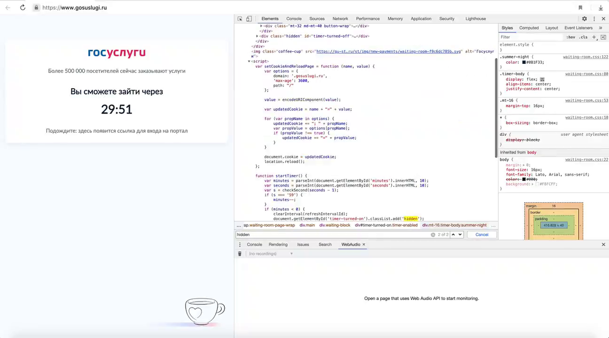 2 июля на сайте gosuslugi.ru произошёл сбой. Сервер не выдержал 500 тысяч одновременно активных пользователей и на сайте был включён таймер. Каждому зашедшему пользователю нужно было подождать 30 минут, чтобы воспользоваться сайтом. При обновлении страницы, таймер сбрасывался. Разработчик из Петербурга Евгений Телегин смог обойти этот таймер. Он открыл исходный страницы и отредактировал его. А именно - нашел блок <div> c классом "hidden" и идентификатором "timer-turned-off". Удалил у этого элемента класс "hidden". После чего продолжил работу с сайтом, а окно с таймером исчезло В твиттере (https://twitter.com/zhenyaloveseat/status/1410889225889853440?s=20) Телегин опубликовал видео, в котором показал, как зайти на сайт, не ожидая 30 минут. Сейчас сайт "Госуслуг" работает в стабильном режиме. #новость #уязвимость