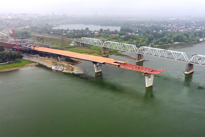 Строители четвертого моста через Обь в Новосибирске сообщили о том, что накануне своего профессионального праздника, Дня строителя, завершили шестой этап надвижки пролетного строения. Фактически треть надводной части сооружения уже завершена. Как сообщают в пресс-службе группы «ВИС», строительный дивизион успешно завершил очередную стадию надвижки пролётного строения моста через реку Обь в Новосибирске. Дополнительные 45 погонных метров вытянулись над рекой, а общий вес смонтированных металлоконструкций в рамках этапа составил 605 тонн. – Всего с марта 2021 года надвинуто 261 погонный метр и собрано 4175 тонн металлоконструкций, включая аванбек. Общая длина пролётного строения составит 776 метров, общая масса – 10400,8 тонн, включая аванбек весом в 154 тонны, – подчеркнули в пресс-службе «ВИС». Впрочем, работа на этом не прекратилась, поскольку сразу же строители приступили к седьмому этапу надвижки. Длина новой сборки составит 44 погонных метра, а масса – 540 тонн. Кроме того, в групп