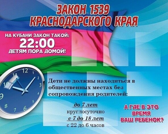 ЗАКОН № 1539-КЗ«ЗАКОН НА КУБАНИ ТАКОЙ: 22:00 — ДЕТЯМ ПОРА ДОМОЙ»