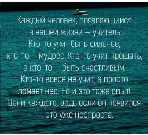 1. Каждый человек в вашей жизни учитель И это правда. Этим летом я проверил это на себе. Люди с одними же и теми чертами будут появляться в вашей жизни до той поры, пока вы не поймете урок, который был вам послан. И не важно делает ли он добро вам или делает зло, главное сесть и задуматься зачем этот человек в вашей жизни, ведь он может дать вам многое. На одного вы посмотрите и научитесь на его ошибках чему-то. Посмотрев на другого, вы поймете, как не нужно себя вести. 2. Нельзя оценивать людей по их предкам И в правду, не нужно судить о человеке по его предкам. Многие говорят зачем нужна история в школе, она нам не пригодится. Но это огромный опыт накопленный годами. Это куча ошибок, которые не стоит повторять. 3. Вокруг только недовольные Проблема в том, что в наше время все и каждый чем-то недовольны, но никто не хочет ничего менять. Все продолжают жить соц. сетями. Но менять нужно не в интернете, а в жизни. Так как она проходит здесь и сейчас, и если что-то не нравится, просто МЕН