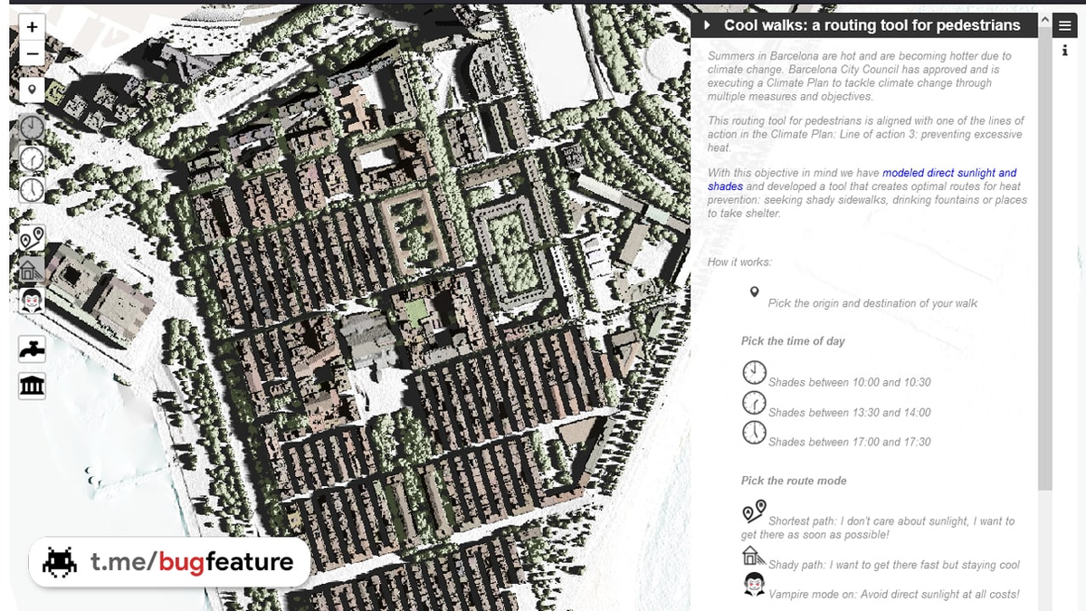 Вернее не мы, а жители Барселоны, для которых вышло приложение Cool Walks (http://www2.bcnregional.com/). Это особые карты которые могут: построить самый прямой маршрут, построить более длинный маршрут с тенью и построить маршрут в режиме "Вампира". Прямой путь прокладывается не обращая внимания на солнце. Маршрут с тенью — маршрут с акцентом на теневые участки дороги. Режим "Вампира" — движение только по тени. Как приложение определяет где тень? Разработчики использовали технологию "Лидар", которое определяет данные о рельефе местности с точностью до 10 сантиметров. Сопоставив это с движением солнца и текущим временем можно определить на какие участки дороги сейчас не попадают лучи солнца и проложить оптимальный маршрут для пользователя.