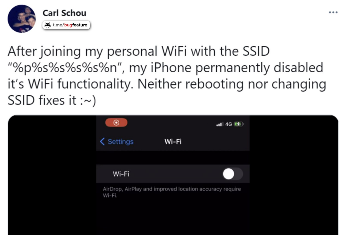 Обнаружен баг (https://twitter.com/vm_call/status/1405937492642123782?s=20) на устройствах Apple: если подключиться к Wi-Fi с названием "%p%s%s%s%s%n", то устройство начнет сильно глючить вызывая сбой сети. Предположительно это ошибка форматирования строки. Причем сбой не устраняется переименованием SSID либо перезапуском устройства. Но к счастью, проблема решается весьма просто: 1. Откройте "Настройки" устройства. 2. Перейдите в "Основные". 3. Выберите пункт "Сброс". 4. Нажмите "Сбросить настройки сети". Поэтому если вы решите подключиться к Wi-Fi своих соседей с похожим названием, то сразу запомните выше указанный метод устранения сбоя. #новость #баг #apple