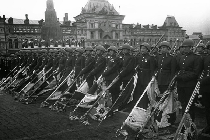 Датой окончания Второй Мировой войны считается 2 сентября 1945 года, но в Европе она закончилась четырьмя месяцами раньше с подписанием акта о безоговорочной капитуляции Германии. Союзники торжествовали, а проигравшим предстояло смириться и ждать своей участи. В это счастливое и непростое время военным корреспондентам удалось сделать немало удивительных фотографий, на которых видна вся суть войны. Начнём с одного из самых известных фото XX века. Красноармейцы опускает гитлеровские стяги на параде Победы 24 июня 1945 года. Житель японской Йокогамы возле своего полностью сгоревшего дома в ходе одной из бомбардировок ВВС США, сентябрь 1945 года Чудом уцелевший, после боевых действий, собор в Мёнхенгладбахе, 30 ноября 1945 года Одни из последних солдат Вермахта сдаются в плен красноармейцу, 18 мая 1945 года Счастливые родители ведут свои чада в первую школу, открытую после войны американскими войскам в Ахене, сентябрь 1945 года Красноармейцы на Курильских островах после проведения удачной
