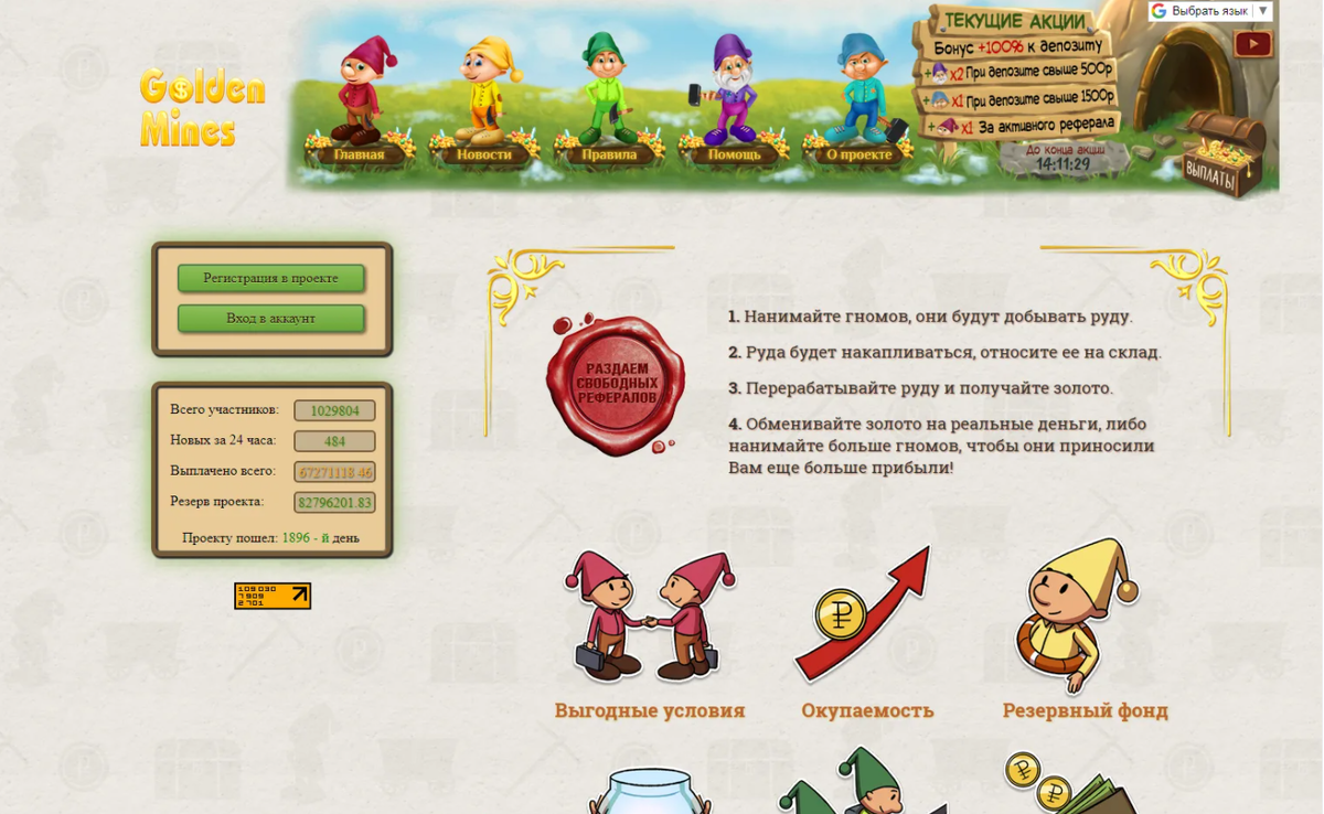 Суть игры заключается в найме гномов, которые будут добывать для Вас руду. Гномы есть разные: «Малыш», «Студент», «Спец», «Бывалый» и «Профи» — всего пять видов. Каждый имеет разную стоимость и производительность. Если в своем аккаунте открыть список нанятых гномов — «Логово наемников», то можно увидеть их характеристики и количество уже имеющихся у Вас.