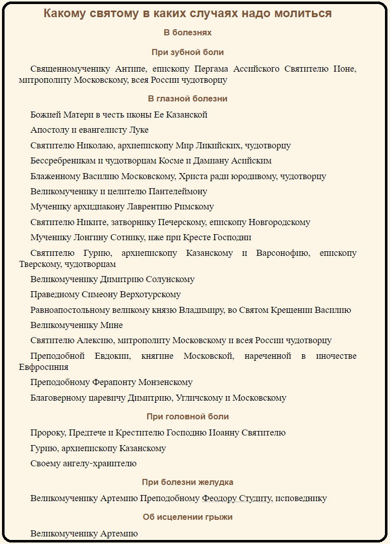 Что вы делаете, когда у вас что-нибудь заболит? Идете к врачу? А потом в аптеку? Настоящие верующие так не поступают. Их лечат специальные люди, как правило усопшие. Вот заболит у верующего зуб, он обращается к священномученику Антипе, епископу Пергама Ассийского Святителю Ионе, митрополиту Московскому, всея России чудотворцу, а желудок заболит? К великомученику Артемию. А если проказа? К мученице Агриппине. От женского кровотечения хорошо лечит целебник преподобный Ипатий Печерский. Не верите? А зря. На православном сайте "Азбука.ру" есть специальный раздел, я бы сказал путеводитель по православным святым, которые лечат каждый по своей специальности. Ссылку давать не буду, но вот небольшой принт-скрин: От чего только не лечат святые. Там есть и оспа, и боли в руках, и грудная болезнь, и горячка. Если кто не в состоянии поставить диагноз, то есть группа святых, которые лечат "от болезненного состояния и вообще от болезней": Есть и святые, которые готовы излечить от самых экзотических