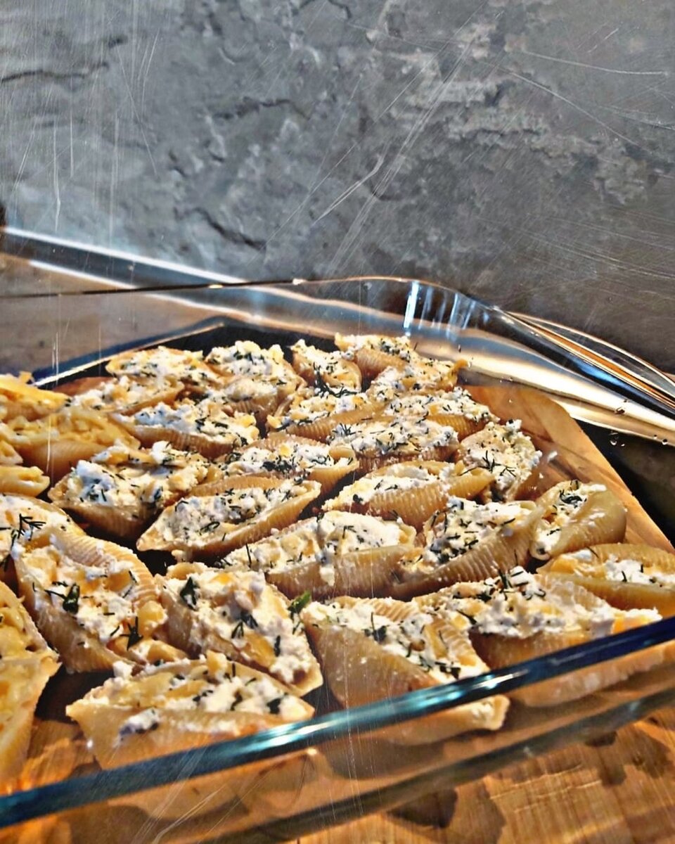 - королевские ракушки (у меня Макфа) 300 гр; - сыр брынза 300 гр; - сыр твёрдый (любой) 200 гр; - свежий укроп; - чеснок; - молоко 400 мл; - сливочное масло 30 гр; - мука пшеничная 2 ст.л. Ракушки отвариваем до состояния ал-денте.Фаршируем их смесью из тёртой брынзы, сыра, укропа и чеснока. Выкладываем в форму. Молоко кипятим, добавляем масло ждём когда масло растает. Далее небольшим количеством подсыпаем муку и хорошо мешаем при этом, чтобы не было комочков. Когда соус станет густым, заливаем им ракушки, посыпаем остатком сыра (примерно 100 гр.) и отправляем в духовой шкаф на 25 минут при 180° Приятного аппетита ❤