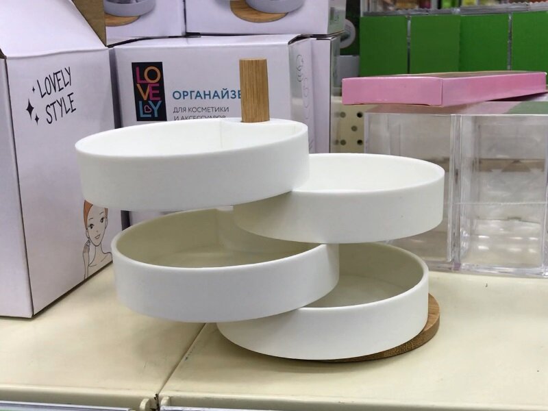 Всем огромный привет! Сегодня я была в магазине Фикс Прайс по адресу г. Ульяновск проспект Нариманова 75, увидела много новинок в бьюти отделе. Делюсь увиденными новинками с вами. Надеюсь вам будет интересно. Появились новые органайзеры для косметики и аксессуаров. 4 секции на деревянной подставке. Наверное в ней будет удобно хранить украшения и бижутерию. Появились новые наборы кистей, в наборе имеется футляр. Всего 5 кистей, все они разные. Есть кисть для пудры и румян., кисть-спонж для теней, кисть для теней, косая кисть для теней, и кисть для губной помады. Массажер для головы, который улучшает кровообращение, стимулирует рост волос. А также его можно использовать для массажа головы во время принятия душа. В составе термопластичная резина и АБС. Производитель Китай. Еще одна новинка, которая мне понравилась. Это зеркало двухстороннее, с двойным увеличением. На оригинальной подставке деревянной, с двумя полочками. Зеркало очень удобное. Когда оно стоит на столе, оно как раз напрот